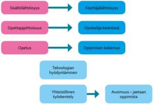 Koska oppimiskokemus on henkilökohtainen, oppimisen muotoilussa keskitytään oppimisen kokemuksen muodostumiseen: miten, milloin ja mitä teknologisia välineitä käyttäen opiskelija oppii, sen sijaan että keskityttäisiin siihen, miten opettaja opettaa opittavat sisällöt. Opetuksen suunnittelun sijaan muotoillaan opiskelijan tekemistä. Muotoiluprosessissa huomio on opiskelijan eikä opettajan toiminnassa. Yhtenä oppimisen muotoilun tavoitteena onkin siirtyä opettajajohtoisuudesta ja sisältölähtöisyydestä opiskelijalähtöisyyteen, tai palvelumuotoilun termein käyttäjälähtöisyyteen. Tuija Marstio (2021) kuvaa tätä muutosta opetuksen suunnittelusta oppimisen muotoiluun kuviolla 1.