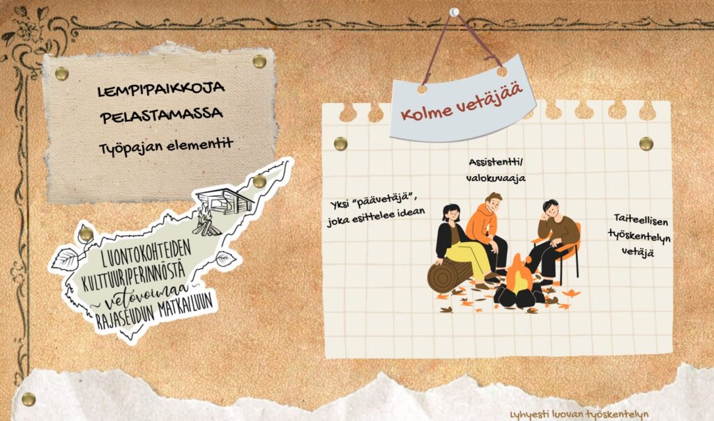 Lukioikäisille suunnattu Lempipaikkoja pelastamassa -työpaja on esimerkki hankkeessa kehitetystä, pilotoidusta ja mallinnetusta työpajasta, jota voidaan toteuttaa monenlaisissa ympäristöissä. Työpajan idea on herätellä nuoria pohtimaan lähiluonnon ja kulttuuriympäristön merkitystä omassa elämässään ja sitä kautta oivalluttaa heitä ymmärtämään luonnon ja kulttuuriperinnön merkitystä laajemmin yhteiskunnassa (Lonka 2015).