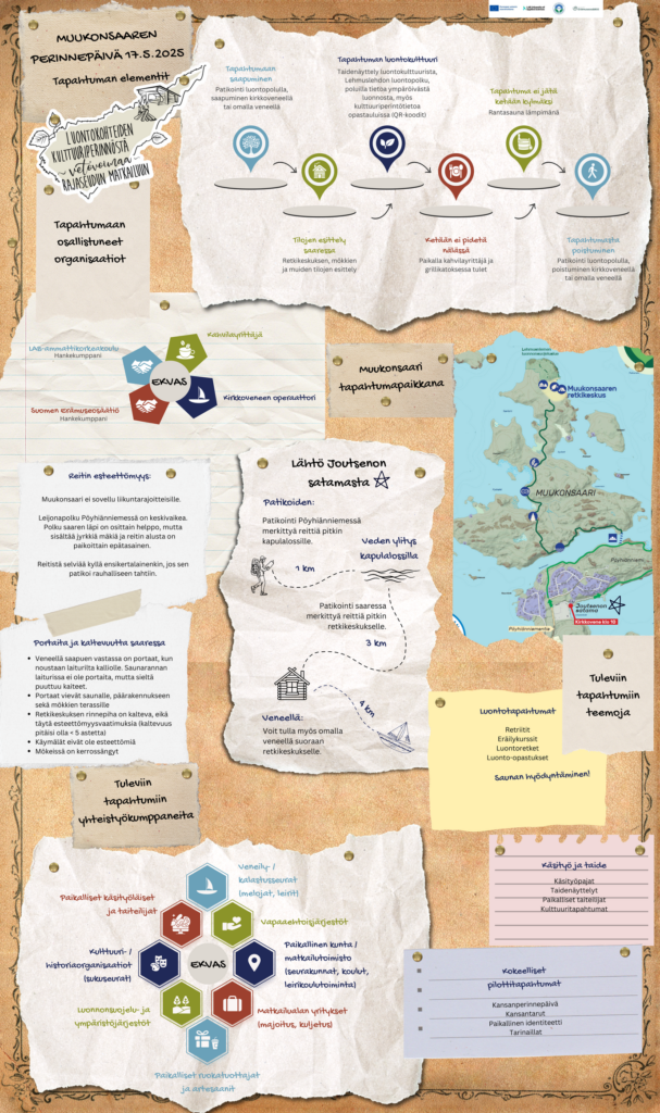 Perinnetapahtuma pilotoitiin Lappeenrannan Muukonsaaressa. Muukonsaaren perinnepäivään saavuttiin jalkaisin, kirkkoveneellä tai omalla veneellä. Patikoijat pääsivät testaamaan uutta kapulalossia. Saaressa sijaitsevaan, aiemmin leirikäytössä olleeseen rakennukseen oli koottu näyttely alueen luontokohteista. Lehmuslehdon luontopolkua kiertäessä saattoi tutustua ympäröivään luontoon ja saaren kulttuurihistoriaan opastaulujen ja niissä olevien QR-koodien kautta. Tapahtumapäivässä oli paikallisen yrittäjän tarjoama ruokailu- ja kahvimahdollisuus. Myös sauna lämpeni.