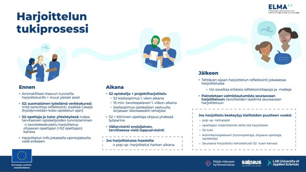 Harjoittelun tukiprosessiin on kuvattu suomen kielen opettajan kanssa tehtävä yhteistyö kielellisesti tukea tarvitsevien opiskelijoiden tunnistamiseksi. Osaamistavoitteiden kirjaaminen selkosuomella on tärkeää opiskelijalle, jotta S2-kielinen opiskelija pystyy kuvaamaan riittävän selkeästi ja konkreettisesti omat tavoitteensa oppimiselleen harjoittelun aikana. Näiden kuvaaminen S2-opettajan tuella yhteistyössä harjoittelua ohjaavan opettajan kanssa auttaa paitsi opettajan tekemää harjoittelun arviointia, myös työelämän sairaanhoitajaohjaajaa suuntaamaan opiskelijan ohjaamista osaamistavoitteiden mukaiseksi.