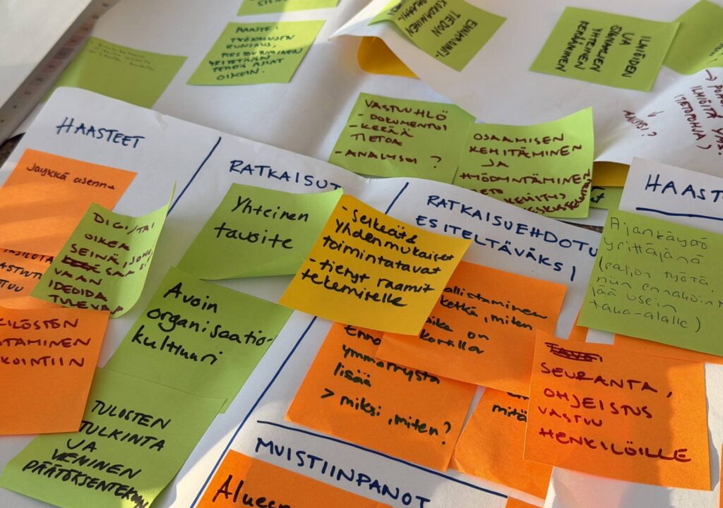 Artikkelikuva: Pienryhmissä post-it-lapuille koottuja havaintoja ennakoinnin haasteista ja toimivista käytännöistä. (Kuva: Mirja Harvistola)