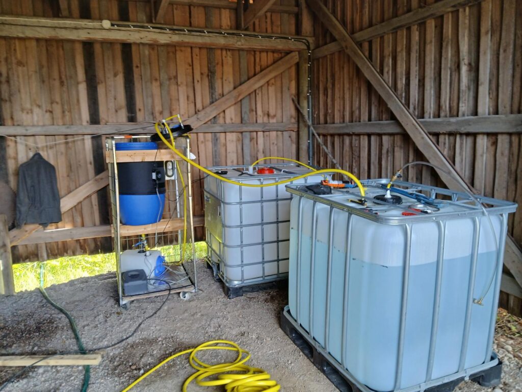 Kuva 2. Niipalan tilalle sijoitettu pilot-laitteisto. Kannelliseen sadevesitynnyriin rakennuttu kuivamädätykseen perustuva biokaasureaktori, jossa syntyvä kaasu kerättiin IBC-konttiin. (Kuva: Ville Puhakka)