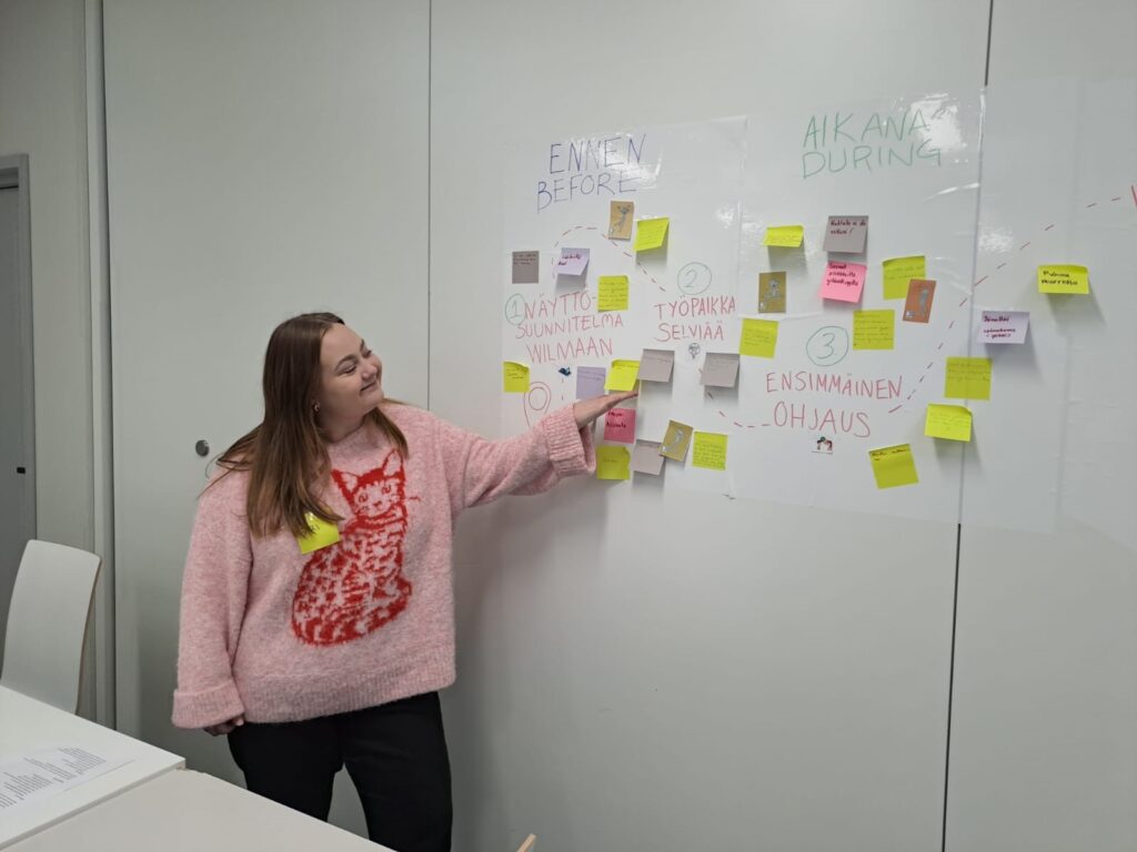 Sote-alan työpaikalla tapahtuvan oppimisen kokemukset syntyvät moninaisissa vuorovaikutustilanteissa kuten esimerkiksi ohjaus- ja perehdytystilanteissa sekä ohjaukseen ja tukeen liittyvissä ohjeistuksissa sekä käytänteissä (Mäkinen 2024). Marraskuussa 2024 Koulutuskeskus Salpauksessa järjestetyssä kaksipäiväisessä Sote Sprintti -tapahtumassa Salpauksen hoiva-avustaja- ja lähihoitajaopiskelijat pääsivät kertomaan oman kokemuksensa työpaikalla tapahtuvasta oppimisesta ja ideoimaan millaisia heidän unelmatyöpaikkansa olisivat ja millainen olisi hyvä työympäristö. Sote Sprintin työpajatyöskentelyä ohjasivat LAB-ammattikorkeakoulun palvelumuotoiluopiskelijat, jotka olivat myös suunnitelleet yhteiskehittämisen työskentelytavat ja valinneet menetelmät. Opiskelijat työskentelivät tiimeittäin ja etsivät ratkaisuja työpaikalla tapahtuvan oppimisen ongelmakohtiin. Keskiössä olivat maahanmuuttajataustaisten opiskelijoiden kokemukset. Sote Sprintti perustuu palvelumuotoilun Design Sprint -työpajamenetelmään, jossa lyhyessä ajassa saadaan esiin paljon kokemuksia sekä kehittämiskohteita ja niistä johdettuja ratkaisuideoita. Sprintissä ideat testataan niiden henkilöiden kanssa, joita aidosti tarvitaan ideoiden toteutukseen. (Mäkinen 2024.) Salpauksen Sprintissä oli opiskelijoiden lisäksi mukana 10 työelämän edustajaa eri sote-alan työyhteisöistä. Työelämän edustajilta tiimit saivat tukea ja sparrausta ratkaisuideoihinsa.