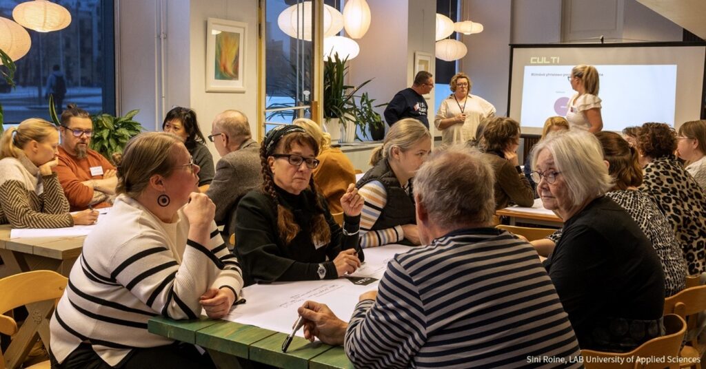 Kuva 1. Yhteiskehittämiseen tutustumista ja päijäthämäläisen kulttuuriperinnön määrittelyä CULTI-hankkeen Kickoff-tilaisuudessa 20.11.2025. (Kuva: Sini Roine 2025)