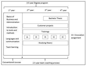 Tradenomitutkinnon kesto on 3,5 vuotta. Ne, jotka valitsevat opiskella tiimioppimisen ja tiimiyrittäjyyden opintopolulla aloittavat opintonsa tavanomaisella tavalla. Ensimmäisen opiskeluvuoden keväällä he perustavat yhdessä omistamansa osuuskuntamuotoisen yrityksen juridiikan lehtorin opastamana. Ammattikorkeakoulu nimittää uudelle osuuskunnalle eli tiimiyritykselle tiimivalmentajan, jonka tehtävä on auttaa tiimiyrittäjiä sekä työryhmästä tiimiksi kehittymisessä, että ammatillisessa kasvussa.