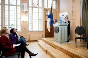 Kuva 1. Latvian yliopiston tutkija Mara Pakalne esittelemässä näkökulmaa soiden ennallistamisen roolista ilmastonmuutoksen hillinnässä ja osana turvallisuusajattelua JTP-konferenssissa. (Rekomaa 2026)